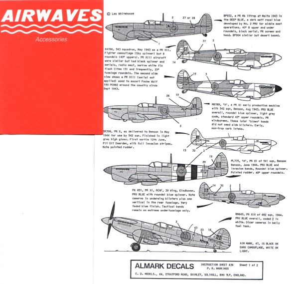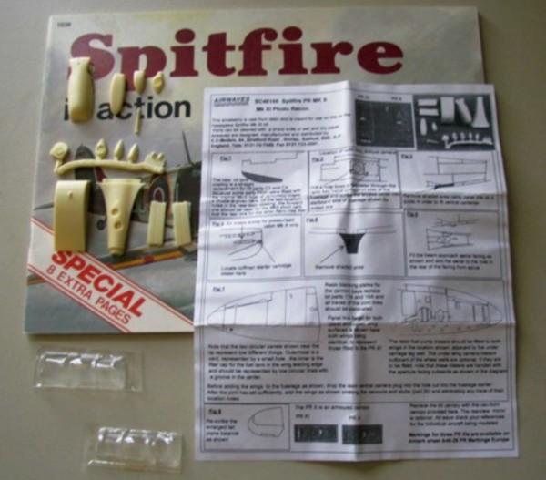 Der Ausgangsbausatz für meine Spitfire PR.Mk.XI bildet der Kit JT79 der Spitfire Mk.IX von Hasegawa. Um daraus die Aufklärerversion Mk.XI bauen zu können wird weiterhin das Umbauset von Airwaves benötigt. Passende Markierungen sind auf dem Bogen von Almarks enthalten. |