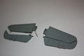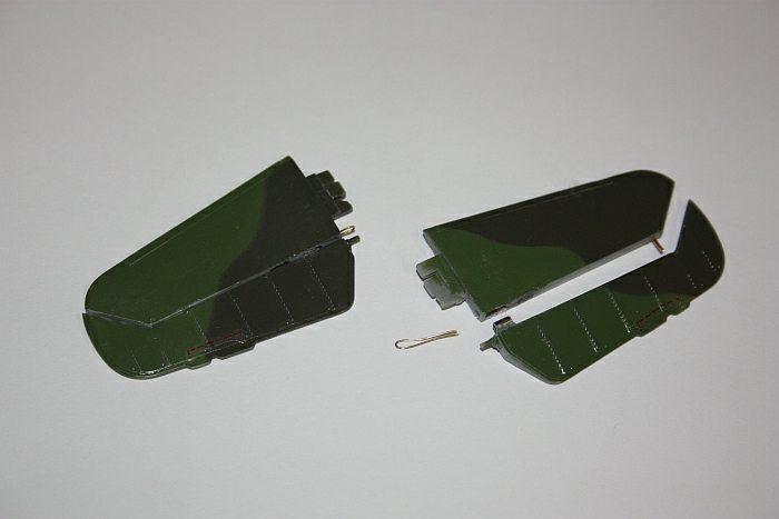 Nach allgemeinen Beiträgen zur Bausatzsondierung, Bemalung und Farbauswahl im Rahmen der Grobabstimmung der Teilnehmer erreichten mich Mitte Mai 2010 die erforderlichen Bauteile. Aufgrund außerhalb des Projekts liegender persönlicher Probleme ging es erst Ende Oktober los. Es wurde eine Trennung mittels Ätzteilsäge in Flosse und Ruder vorgenommen, um eine spätere mögliche Funktionsfähigkeit zu erreichen. Nach Überlegungen, diese Funktionsfähigkeit mittels gezogenem PE-Gussast oder Kupferdraht herzustellen, entschloss ich mich, mittel Kanüle und Stahldraht eine Art Scharnier zu bauen. Ohne Grundierung und Vorschattierung wurde zunächst die Unterseite in RLM 76 gespritzt und sodann maskiert. Die Oberseite wurde in RLM 82 gespritzt und nach Abteilung in Segmente durch Verwendung von UHU-tac mit RLM 81 beendet. Nach Durchtrocknung wurde eine Versiegelung mit Future vorgenommen und die Abziehbilder aufgebracht. "Funktionsprobe" und wieder Demontage der Leitwerksverbindung für den Transport. Verpackung durch Abschmink- Pads und Blisterumschlag und Versand zu Torsten.