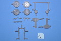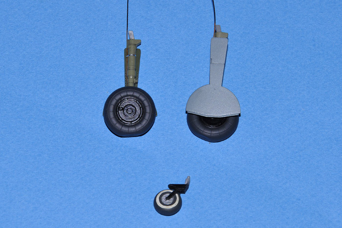 | Nachdem ich die Teile zur "German Modell Masters" erhielt, mussten sie nun in den heimischen Keller nach Großenhain gebracht werden. So machte ich mir einen Plan der Vorgehensweiße. Zuerst stürzte ich mich auf die Räder, die ich verklebte, verschliff und die abgeflachte Unterseite darstellte. Dann lackierte ich die Lauffläche anthrazit und die Felge schwarz. Am Spornrad bekam das Rad noch ein weißes Band!  Zunächst fing ich an, die am Fahrwerksbein angespritzten Hydraulikleitungen runterzuschleifen und durch Kupferdraht zu ersetzen. Die Hydraulik  des Fahrwerksbeins habe ich zuerst mit glänzend schwarz lackiert und mit Silber von Alclad überlackiert. Nachdem ich die Silberne Fläche maskiert hatte habe ich den Rest des Fahrwerksbeins lackiert. Abschließend alterte ich es dezent und brachte noch etwas Tiefe in die Kontur. Zum Schluss brachte ich noch jeweils zwei Schlauchschellen aus Alu-Klebeband an. Dann musste nur noch alles montiert, verpackt und zur Endmontage geschickt werden.