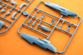 aber je Variante nicht alle benötigt werden. Die anderen vier Spritzrahmen sind zweigeteilt. Ein Teil Tragflächen, Leitwerk und Ruder,
