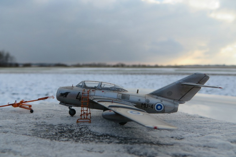 | Mit Bezug zu einem Vorbild macht der Bau einfach mehr Spaß und Eduard zeigt eindrucksvoll was in diesem Maßstab möglich ist. Die Tragflächenhinterkanten sind selbst in 1:144  vorbildgetreu und die Passgenauigkeit erübrigt Spachtelmasse nahezu völlig. Hier auf der Vignette wurde die Mukelo,  auf die verschneite Start- und Landebahn geschleppt, um einen Bremslauf durchzuführen.                  |