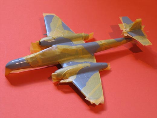 Als erstes wurden die Fahrwerkschächte Aluminium gespritzt und abgeklebt, bevor es mit der Tarnbemalung weiterging.