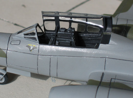 Die letzte Hürde bestand in der Cockpithaube. Ursprünglich hatte ich vor, sie geschlossen darzustellen, da sie mir etwas zu dick für die geöffnete Präsentation erschien. Wie sich allerdings herausstellte, passte die Haube überhaupt nicht im geschlossenen Zustand auf das Cockpit. Und da ich diesen „Wintergarten“ nicht neu ziehen wollte, blieb mir nichts anderes übrig, als ein paar der fehlenden Innendetails der Kanzel zu scratchen, und sie offen anzukleben. Zum Glück möchte ich fast sagen, denn irgendwie gefällt’s mir so fast besser als geschlossen.