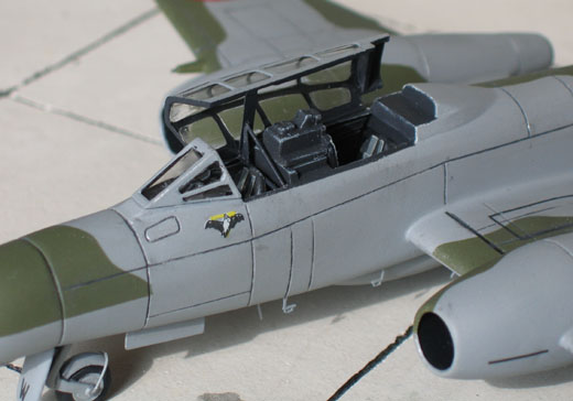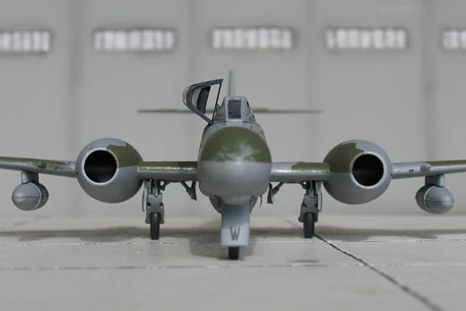 Als finale Lackschicht wurde die Meteor mit Klarlack von Humbrol übernebelt. Ein leichtes Drybrushing mit Alu, besonders entlang der Blechstöße bzw. an stark beanspruchten Stellen wie unterhalb des Cockpits, vervollständigte die Alterung. Bei solchen Aktionen sollte man sich immer vorher klar machen, welche Partien beim Original überhaupt aus Metall bestanden, so dass man nicht wie ich den Anfängerfehler macht, die Triebwerkseinläufe zu drybrushen, obwohl sie in natura aus Holz bestanden! Zum Glück habe ich dort so leicht gealtert, dass es nur bei näherem Hinsehen auffällt.