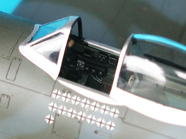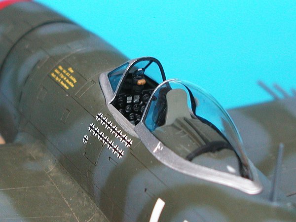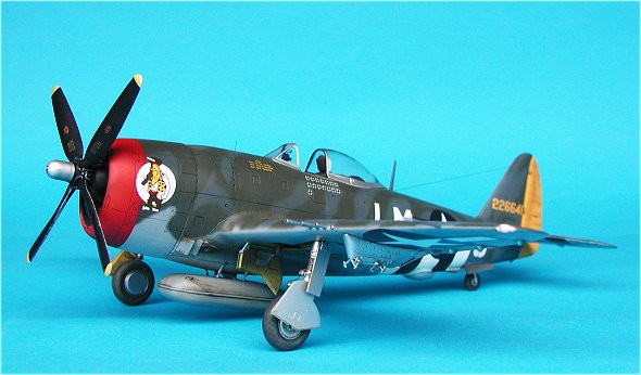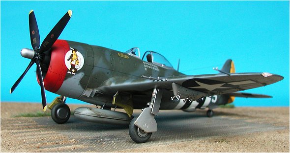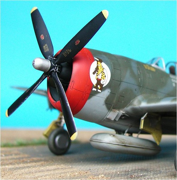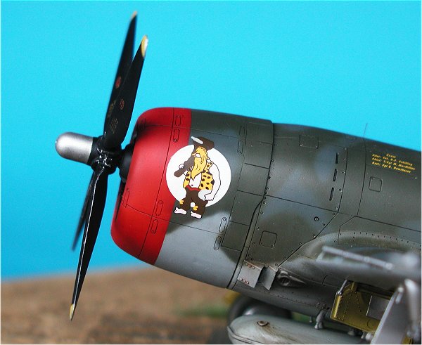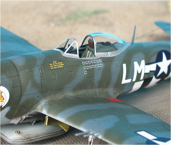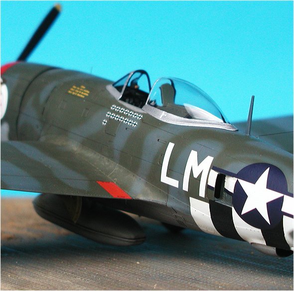 | Die Lackierung ist Freihand mit der Airbrush durchgeführt worden. Die D-Day-Streifen auf dem Unterrumpf sind ebenfalls lackiert. Es liegen dem Bausatz zwar Decals bei, der betreffende Bereich mit der komplexen Turboladerverkleidung auf der Rumpfunterseite ist jedoch nur bedingt für den Einsatz von Decals geeignet. Eine Lackierung ist da auf jeden Fall die bessere Lösung. Bei den Tarnfarben kamen wie so oft Farben von Xtracolor ins Spiel.                  |