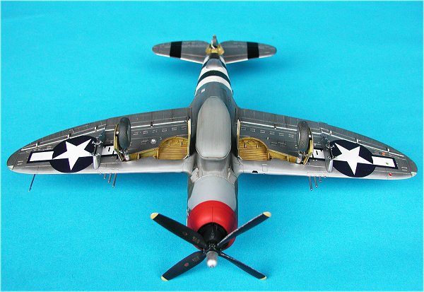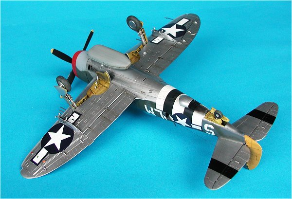 | Die Passgenauigkeit des Bausatzes ist hervorragend, einziger Wehrmutstropfen ist, wenn man sich für die Darstellung des Modells mit eingefahrenen Flaps entscheidet, sollte auf den Übergang Rumpf-Flap besonders geachtet werden. Dort sind einige kleinere Anpassungsarbeiten zu leisten. Die meisten zeitgenössischen Aufnahmen von parkenden Thunderbolts zeigen eingefahrene Flaps.                  |