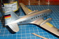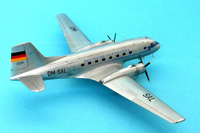 | Die IL-14 der Deutschen Lufthansa DM-SAL aus dem Jahre 1955... wie die Recherche letztlich ergab, hat sich Amodel an dem Lufthansa Retro- look der DM-SAL aus dem Elbe Flugzeugwerk in Dresden orientiert. Die DM-SAL hat zwar nun den alten, 1955er Anstrich wieder, aber in einigen farblichen Details weicht sie von damals ab. Auch die technisch ist sie auf den Stand der Außerdienststellung von 1984. Damals gab es noch keine „Majak“ auf und unter dem Rumpf. Der hauptsächliche Unterschied wird einem klar, wenn man alte Aufnahmen mit denen von der heute in  Dresden abgestellten DM-SAL vergleicht. Damals hatten die meisten Il-14 auf der rechten Rumpfoberseite so einen Art „Blitzableiter“. Diese Antenne nennt sich RSB-5/234 und wurde später durch eine verkleidete Variante ersetzt. Es gab Flugzeuge, die hatten rechts und links diese Antenne, bis sie noch später ganz verschwunden war.  Da ich aber diese frühe Il-14 bauen wollte, musste ich auch diese Antenne nachbauen.
