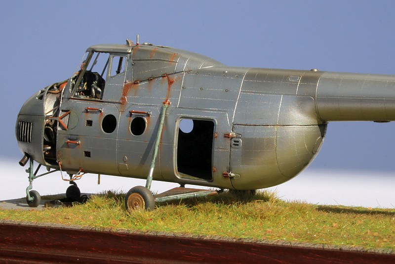 | GeschichteIm September 1951 begann unter Einbeziehung der Erfahrungen mit der Mi-1 und aufgrund der Notwendigkeit einen größeren Hubschrauber für militärische und zivile Einsatzzwecke zu schaffen, die Projektierung eines 12sitzigen Transporthubschraubers. Dem Kollektiv um M.L. Mil wurde für die Umsetzung und Realisierung nur ein Jahr Zeit gegeben. Der Erstflug der Mi-4 muss im Mai 1952 stattgefunden haben. Der erste Prototyp war noch mit dem Sternmotor Schwetzow Asch-62IR mit 1000 PS reichlich unter motorisiert. Erst bei den Folgemustern und Serienmaschinen kam der 14 Zylinder Doppelsternmotor Asch-82W mit 1125kW (1700 PS) Startleistung zum Einbau. Bereits im Sommer 1952 sind die ersten Serienhubschrauber ausgeliefert worden. Wegen der gestrafften Flugerprobung flossen in der Folgezeit viele Änderungen in die Serienfertigung ein. Große Probleme bereitete die Festigkeit und somit die Betriebsdauer der Tragschraubenblätter, die erst mit einer grundsätzlichen Änderung der Technologie 1955 beseitigt werden konnte. Im Zeitraum von 1956 bis 1960 wurden mehrere Nutzlastweltrekorde sowie ein Geschwindigkeitsrekord aufgestellt. Auf der Weltausstellung 1958 in Brüssel wurde die Mi-4 mit einer Goldmedaille ausgezeichnet. Mit der Einführung des Hubschraubers Mi-4 begann auch die Entwicklung des Hubschraubers als Waffenplattform. Zur Geschichte meines Modells kann man folgendes sagen. Diese Mi-4A wurde 1963 beim Hubschraubergeschwader 31 (HG-31) in Betrieb genommen. Ab September 1972 wurde diese Maschine kurzzeitig zivil registriert und flog bei der GST mit dem Kennzeichen DM-WSB. Zurück bei der NVA tat sie noch bis 1979 ihren Dienst und wurde dann außer Betrieb genommen. Abgestellt auf auf dem Truppenübungsplatz (TÜP) in Storkow, diente die ausgeschlachtete Zelle dem Chemischen Dienst der NVA zu Übungszwecken.