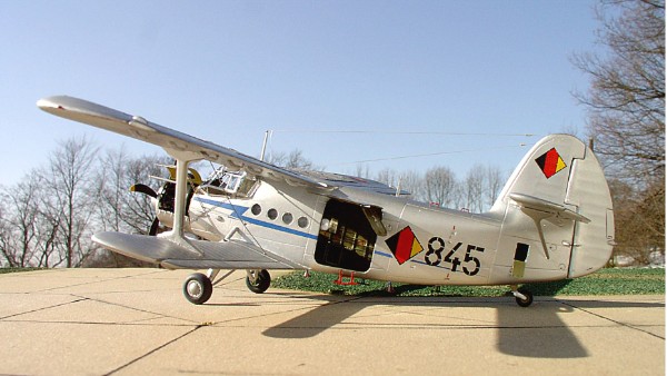 Die "845" ist eine An-2P die zuerst von der DDR- Lufthansa (DM-SKA, c/n. 17207) übernommen und geflogen wurde. Das war am 8.2.1957. Der blaue Blitz unter der Fensterreihe lässt die Lufthansa Herkunft noch erkennen. Im April 1958 wurde sie an die NVA (TS-27, Dresden) weitergegeben und flog dann noch einige Zeit mit dieser seltenen, aber eindrucksvollen Bemalung, bevor sie auch ein dunkelgrünes Tarnkleid bekam.