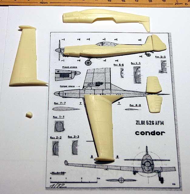 Hora, kurz MIKU, ist bekannt für seine qualitativ guten Resinmodelle, welche die Highlights der tschechischen Luftfahrtgeschichte aufarbeiten. Der mir vorgelegte Bausatz besteht aus 23 Resinteilen, wobei die Gussqualität dieses Bausatzes nicht immer voll überzeugen konnte. Die Flügelendkanten und Profilnasen waren zu dick und viele Teile hatten Lufteinschlüsse. Versenkte Paneellinien und gut strukturierte Bespannungsflächen an Rumpf und Leitwerk sorgen für eine detaillierte Optik. Die Gerätetafeln sind auf einer transparenten Kunststofffolie gedruckt. Dazu kommt eine Vaku- Kabinenhaube und ein sauber gedruckter Decalbogen. |