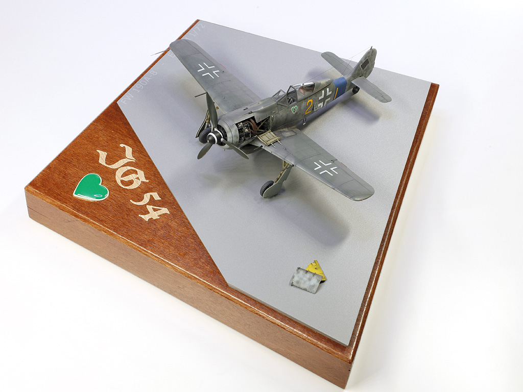 | GrundplatteDie Grundplatte besteht wie immer aus gewachstem Buchenholz.  Beim Schriftzug „JG 54“ leistete der Schneidplotter ganze Arbeit. Das sind Reste von der Holzdeckdarstellung einer 1:350er Tirpitz. Für den Schriftzug „FW 190A-8 – Eduard 1/72“ erstellte ich ebenfalls mittels Schneidplotter eine Lackiermaske und konnte so recht komfortabel mit Spritzpistole lackieren. Der Grünherz-Button ist aus der 48er Limited Edition zum Thema JG-54 von Eduard.