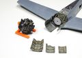 Nächster Programmpunkt war der Motorraum. Klappe hinter dem Motorraum ist in keinem der vielen zusätzlichen Sets vorhanden und war demzufolge zu scratchen. Zur finalen Montage waren noch ein paar Schnitzereien im Rumpf nötig. Den Motorhalter habe ich nur gebaut, damit der Baubericht hier etwas farbenfroher ist. Die Kabel hinter dem Motor hatte ich mehrmals erstellt, bis sie mir gefielen. Ähnlich erging es mir mit dem ETC (Aussenlastträger). Diesen habe ich dreimal gebaut. Grundsätzlich sind dessen Halteklauen im Bausatz zu dick und die Justierstangen nebst Spritleitungen nicht vorhanden, also alles neu. Weitere Details betrafen das Revi, die Schusskamera in der linken Tragflächenvorderkante. Für die Waffenläufe bohrte ich die ursprünglichen Montagelöcher etwas auf, verklebte ein Rundprofil, welches danach mittig aufgebohrt wurde. So kann man die Läufe schön zentriert verkleben.