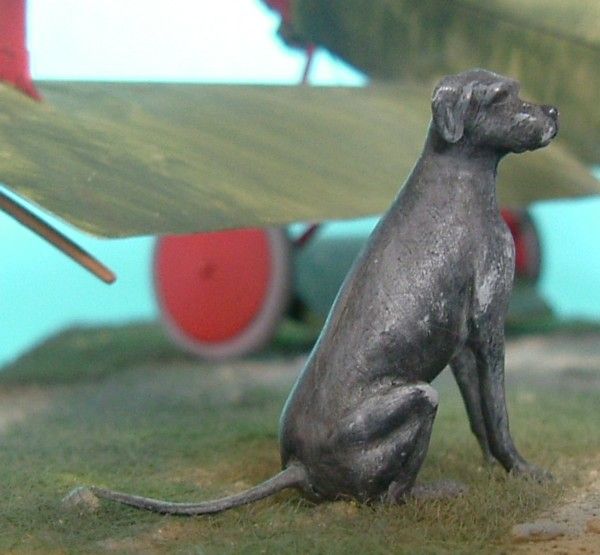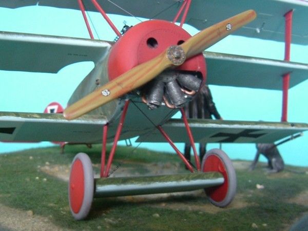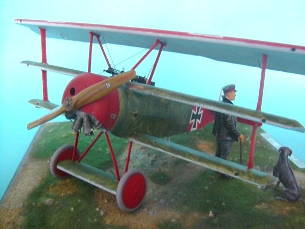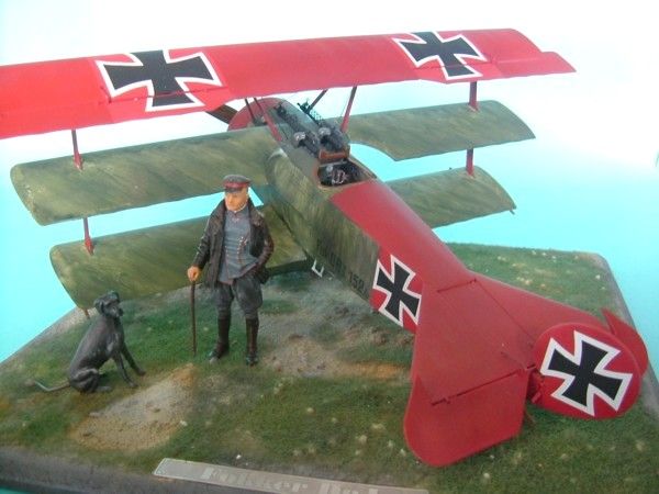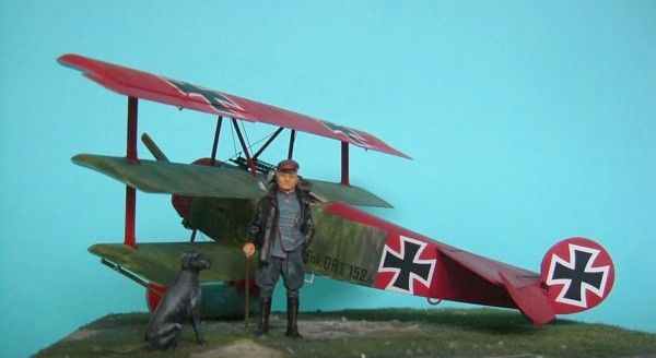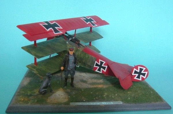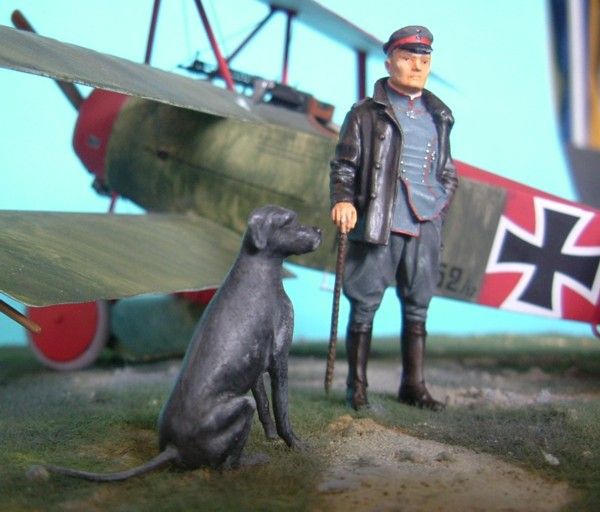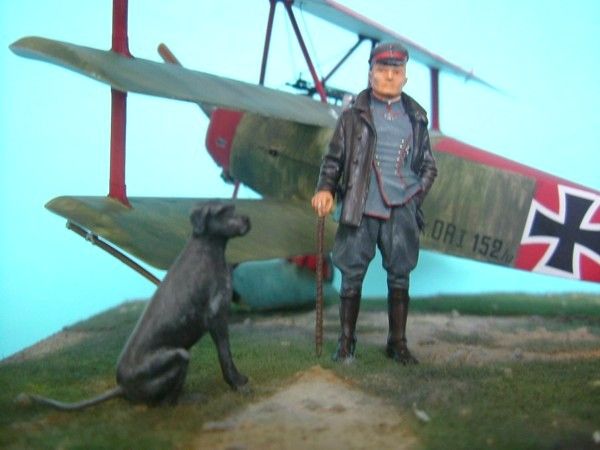 Das Modell meiner Dr.I ist von Roden mit Verwendung von Eduardätzteilen Die Decals sind von Cutting Edge. Die Figur Manfred von Richthofens und seines Hundes Moritz ist von Andrea. Als Grundplatte habe ich eine MDF-Platte mit den Maßen 20x20cm benutzt. Auf diese wurde mit einem Gemisch aus Vogelsand und Weißleim das Gelände modelliert und mit Streugras aus dem Eisenbahnzubehör begrünt.