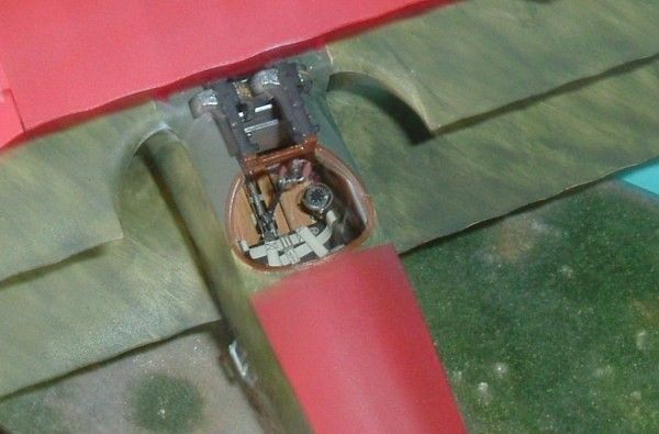 Um die bei Fokker Dreideckern typische gestromte Bemalung nachzubilden habe ich zunächst einen hellen beigen Farbton mit Farben von Tamiya gespritzt. Nach Trocknung habe ich die Fläche mit Terpentinersatz befeuchtet Anschließend wurde mit einem breiten Flachpinsel Dunkelgrün aufgepinselt fast wie beim Trockenmalen. Der Pinsel wird dabei erst wieder mit Farbe versehen wenn er kaum noch Farbe abgibt