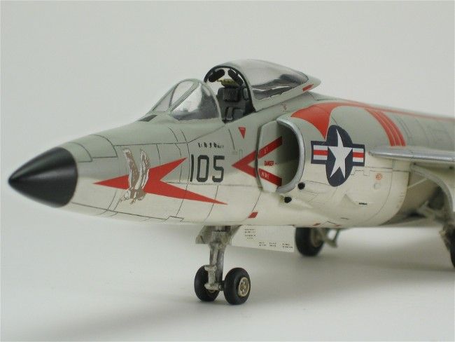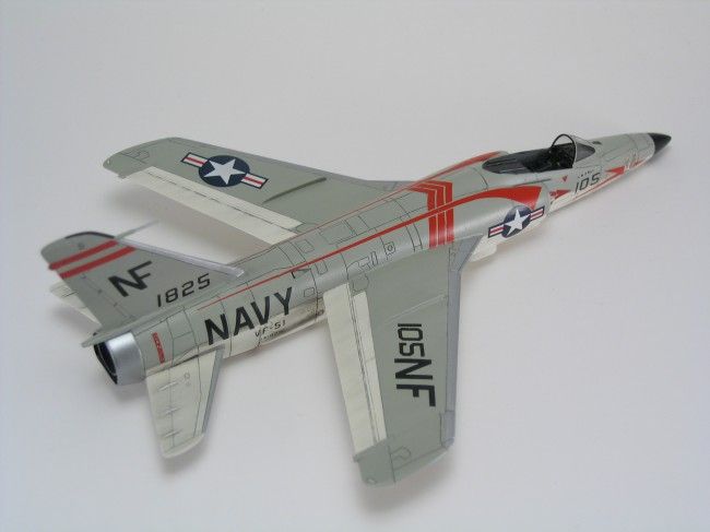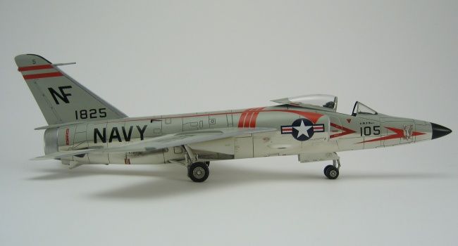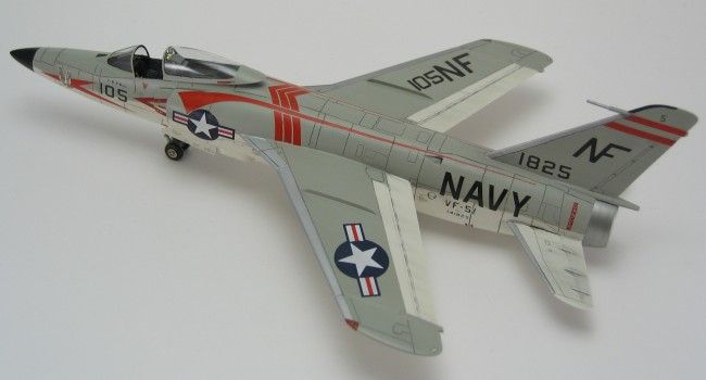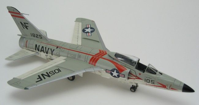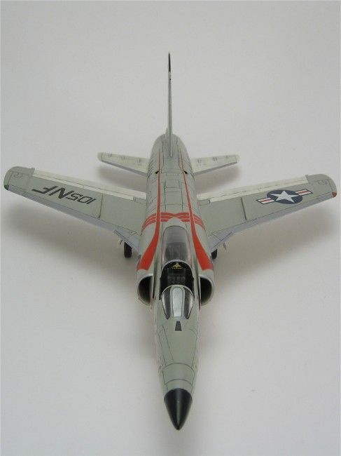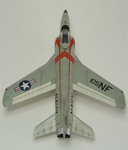 Ursprünglich sollte Grummans Tiger vom Konzept her eine überarbeitete Version der erfolgreichen F9F-6 Cougar werden. Daher wurde ihr zuerst auch die Bezeichnung F9F-8 gegeben, die in F9F-9 umgeändert wurde, als die letzte Cougar-Serie erstere in Beschlag nahm. Letzten Endes hatte der Tiger-Entwurf aber weniger Gemeinsamkeiten als Unterschiede zur Cougar, so dass die Bezeichnung im April 1955 abermals geändert wurde, in F11F-1 (die F10F war schon von Grummans Schwenkflügelprojekt Jaguar besetzt). Der Prototyp YF9F-9 flog am 30. Juli 1954 zum ersten Mal.Die ersten 39 Serienmaschinen hatten noch eine kürzere Nase als die nachfolgenden Produktionslose. Mein Modell gehört zu den so genannten „long nose Tigers“, den 157 Flugzeugen, die als Vorbereitung für den Einbau eines Radars mit einer verlängerten Nase ausgestattet wurden. Allerdings kam es anders, und die vorgesehenen Radargeräte wurden nie installiert.