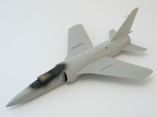 Die Schiebehaube wird für die spätere Lackierung mit etwas Weißleim fixiert. Da ich sie am fertigen Modell offen zeigen wollte, wurden im Cockpit hinter dem Schleudersitz und in der Haube selbst ein paar Strukturen aus heißgezogenen Gussästen und Ätzteilresten hinzugefügt. Wertvolle Hilfe leisten hier Detailaufnahmen des Originals, die sich im Internet finden lassen (siehe Referenzen). |
