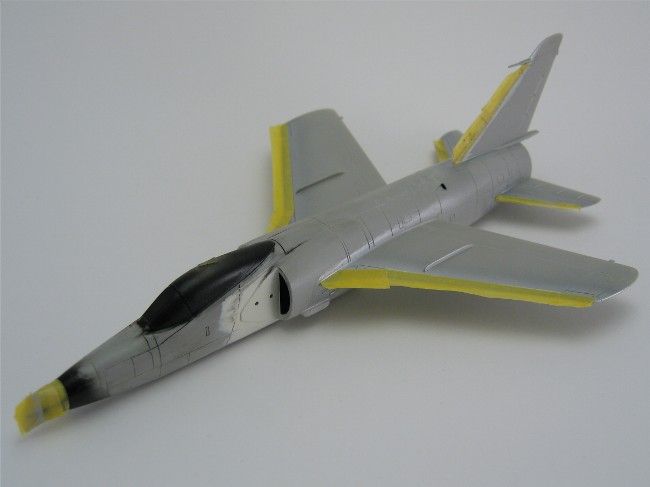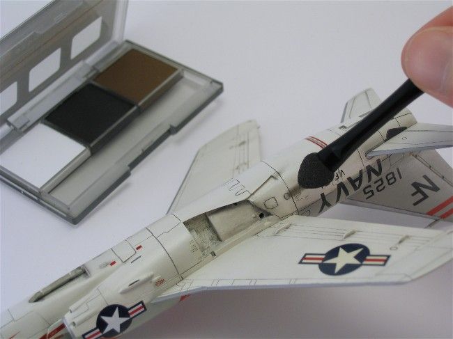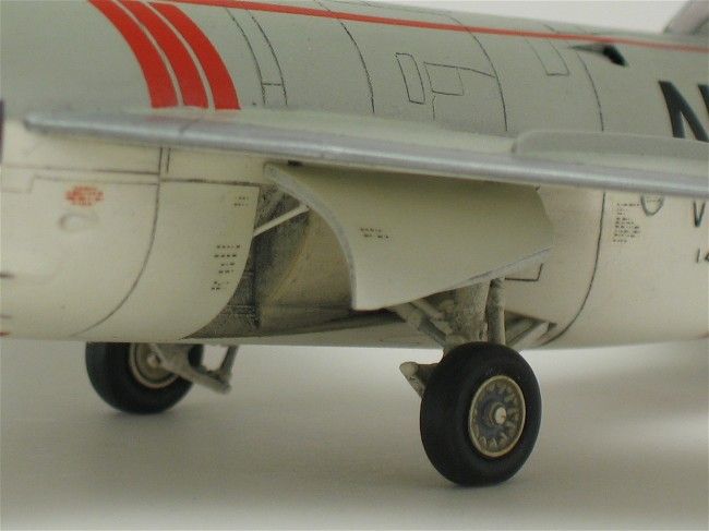 Fast schon ein Charakteristikum für alle Tiger ist die Schmutzspur am Rumpf hinter dem Steuerbordflügel. Sie stammt von zwei Öffnungen im Rumpf, die die Kühlluft des J65 Triebwerks nach draußen ableiten. Das J65 war nicht dafür ausgelegt, den Ölanteil aus der Abluft herauszufiltern, sondern blies ihn einfach mit ab, was zu seiner Bezeichnung als „das einzige Triebwerk, das um ein Ölleck herum konstruiert wurde“ führte. Daher die mal mehr und mal weniger stark ausgeprägte Schmutzspur.Das abschließende Finish erfolgte mit Mattlack von Vallejo Model Air.