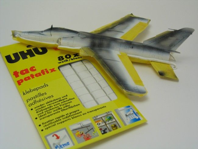 Die schwarze Nase macht den Anfang, danach kommen die silberfarbenen Flügelvorderkanten und Lufteinlaufskanten dran. Nachdem diese Bereiche abgeklebt sind, folgt die weiße Unterseite, für die ich Weiß 05 aus dem Revell Aqua Color Programm benutzte. Das trifft zwar nicht 100%ig FS 17875 „Gloss White“, aber Weiß war hier für mich gleich Weiß – der Fachmann möge es mir verzeihen. Bei der Oberseitenfarbe FS 36440 „Light Gull Gray“ nahm ich es hingegen wieder sehr genau. Hier kam der passende Farbton aus dem Programm von JPS Color zum Einsatz, der diese charakteristische Navy-Farbe wirklich ausgezeichnet trifft. Den leicht welligen und unscharfen Farbübergang zwischen Weiß und Grau erzielte ich, indem ich ihn mit Uhu Tac abklebte. Dieses lässt sich wie Knetgummi formen, hinterlässt aber keine Rückstände, wenn man es in einem angemessenen Zeitrahmen von einer glatten Oberfläche wieder entfernt. Für meine Zwecke rollte ich dünne Uhu Tac Würstchen und legte sie entlang der Farbverlaufskante auf das Modell. Etwas Farbnebel gelangt beim Lackieren unter die Rundung dieser Würstchen und ergibt so eine leicht diffuse Farbgrenze.Die Hauptlackierung war somit abgeschlossen und eine Schicht Future konnte in Vorbereitung auf die Decals aufgetragen werden.