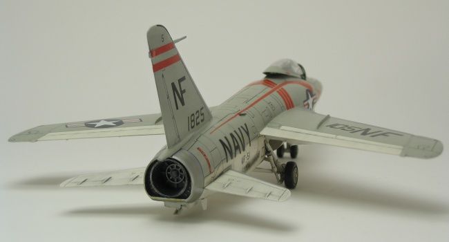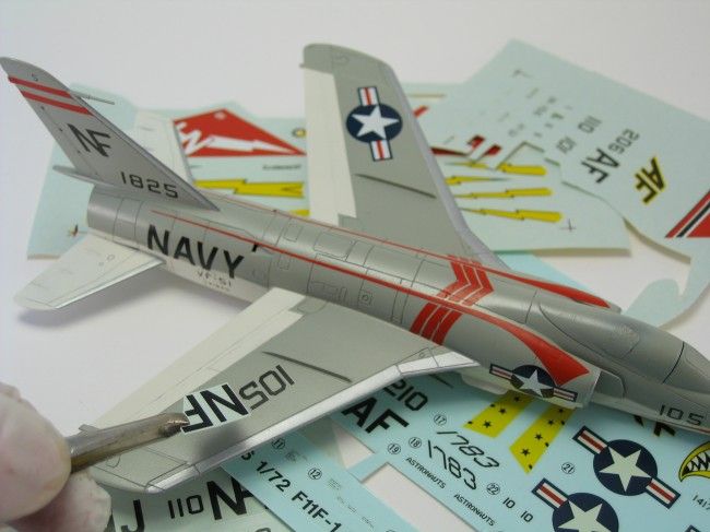 Ursprünglich wollte ich mit Hilfe eines alten Microscale Bogens (72-255) eine Maschine der VF-121 darstellen, da mir deren rote Nasenmarkierung und das rote Seitenleitwerk besonders gut gefielen. Leider ließen sich die links- und rechtsseitig geteilten Nasenmarkierungen aber nicht zufriedenstellend, will sagen nahtlos, zu einem ganzen zusammenfügen. Daher schaute ich mich auf dem besagten Bogen nach einer Alternative um, die sich mir dann auch in dieser F11F-1 der VF-51 „Screaming Eagles“ eröffnete. Mit Geduld und gutem Zureden gelang es schließlich, alle Decals an ihren vorgesehenen Platz zu bekommen. Standardmarkierungen wie die