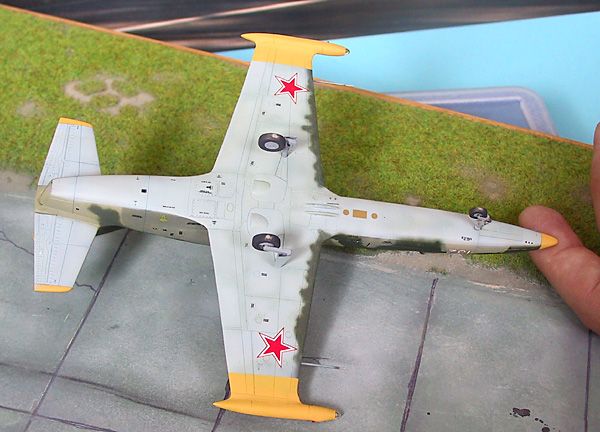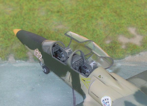 | Der Zusammenbau erfolgte ohne größere Probleme. Man sollte jedoch die Lufteinläufe unbedingt an die Rumpfhälften kleben und bearbeiten (Spachteln, Schleifen, Gravieren) bevor man die Tragflächen und den Rumpf verbindet. Man kommt nach der Montage der Tragflächen sehr schlecht an die Unterseite der Lufteinläufe. Als zweites ist beim Einbau der vorderen Instrumentenbrettabdeckung sorfältiges Einpassen notwendig. Der dritte Schwerpunkt stellt das etwas magere Bugfahrwerk dar, welches ein wenig aufgepeppt werden sollte.